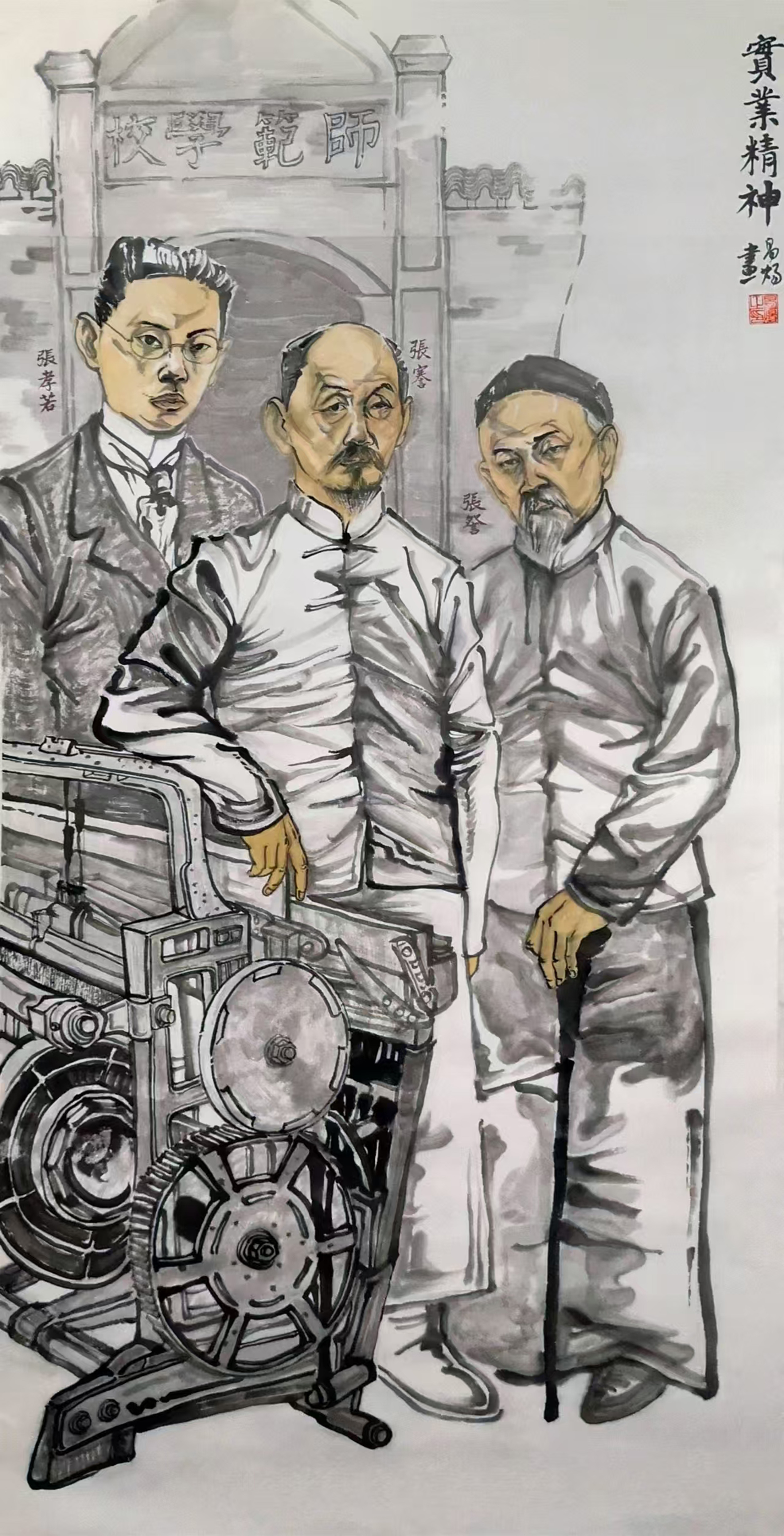 作品用写意的手法刻画南通极具代表性的爱国实业家张謇,及陪伴他共同创业的兄弟张詧和儿子张孝若。前排的亨利织布机和背景的师范学校老校门都是张氏有代表性的实业手笔。整幅画面旨在展示奋斗不止、砥砺前行的精神面貌。